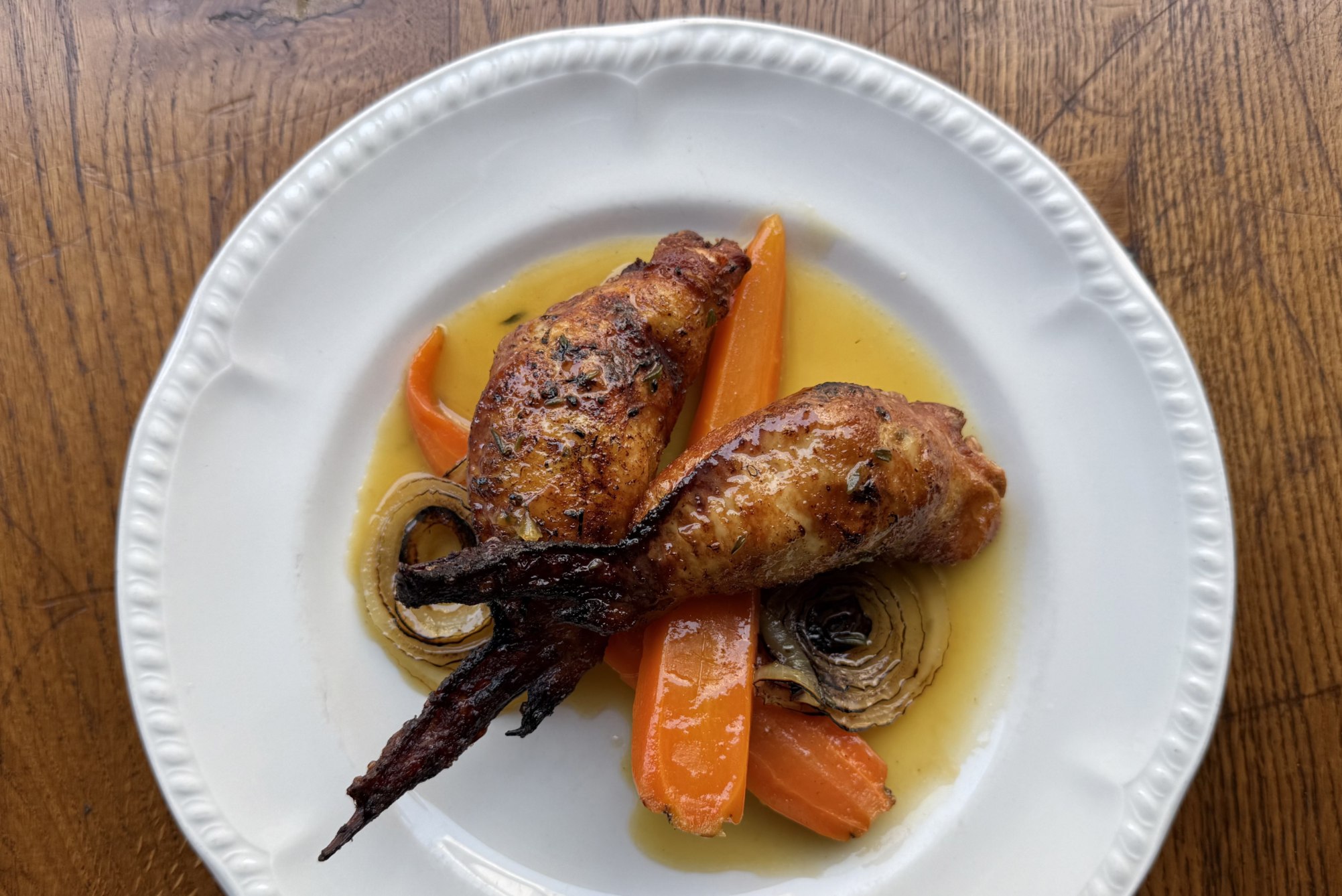8. הגשה: מכניסים את הבצל והגזר למחבת עם הרוטב המצומצם, מעבירים לצלחת ומניחים מעל את הכנפיים. מגישים עם הוינגרט לטבילה.